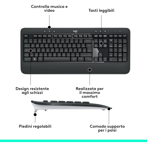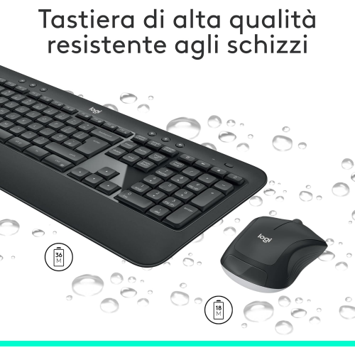 La tastiera non necessitera' di nuove batterie per ben 36 mesi e il mouse restera' carico per 18 mesi. La tastiera e' resistente agli schizzi fino a 60 ml di liquido e i caratteri sui tasti non sbiadiranno facilmente grazie alla tecnica di stampa resistente alle abrasioni.