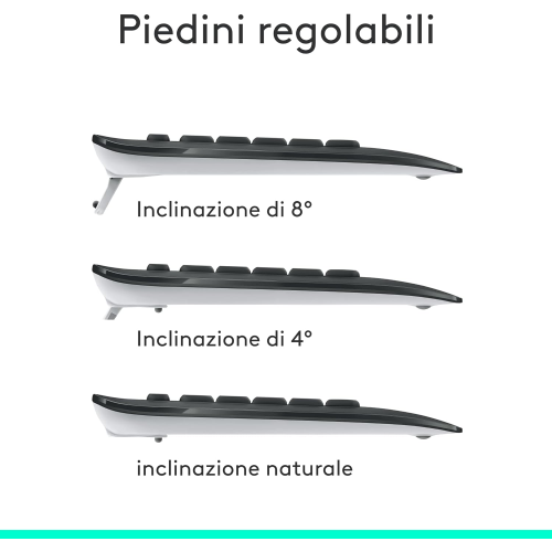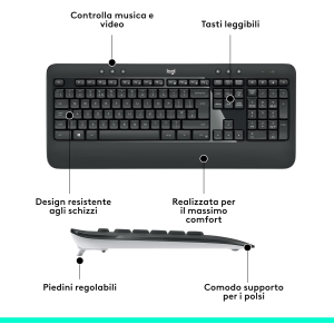 I tasti dedicati pratici ed essenziali offrono un accesso diretto ai dispositivi multimediali, alla calcolatrice e alle funzioni di controllo della batteria. I tasti Fn preimpostati possono persino essere personalizzati in Logitech Options per soddisfare le specifiche necessita' .