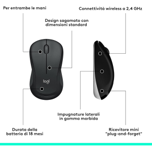 La forma sagomata e le morbide impugnature in gomma del mouse wireless si adattano perfettamente al palmo della mano e il massimo della precisione e' garantito da un controllo del cursore preciso e dal tracciamento ottimizzato.