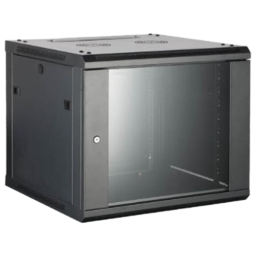 Armadio rack 19" da parete, 12U, dimensioni 600×450×635 mm, porta frontale in vetro temprato e carico statico fino a 40 kg.